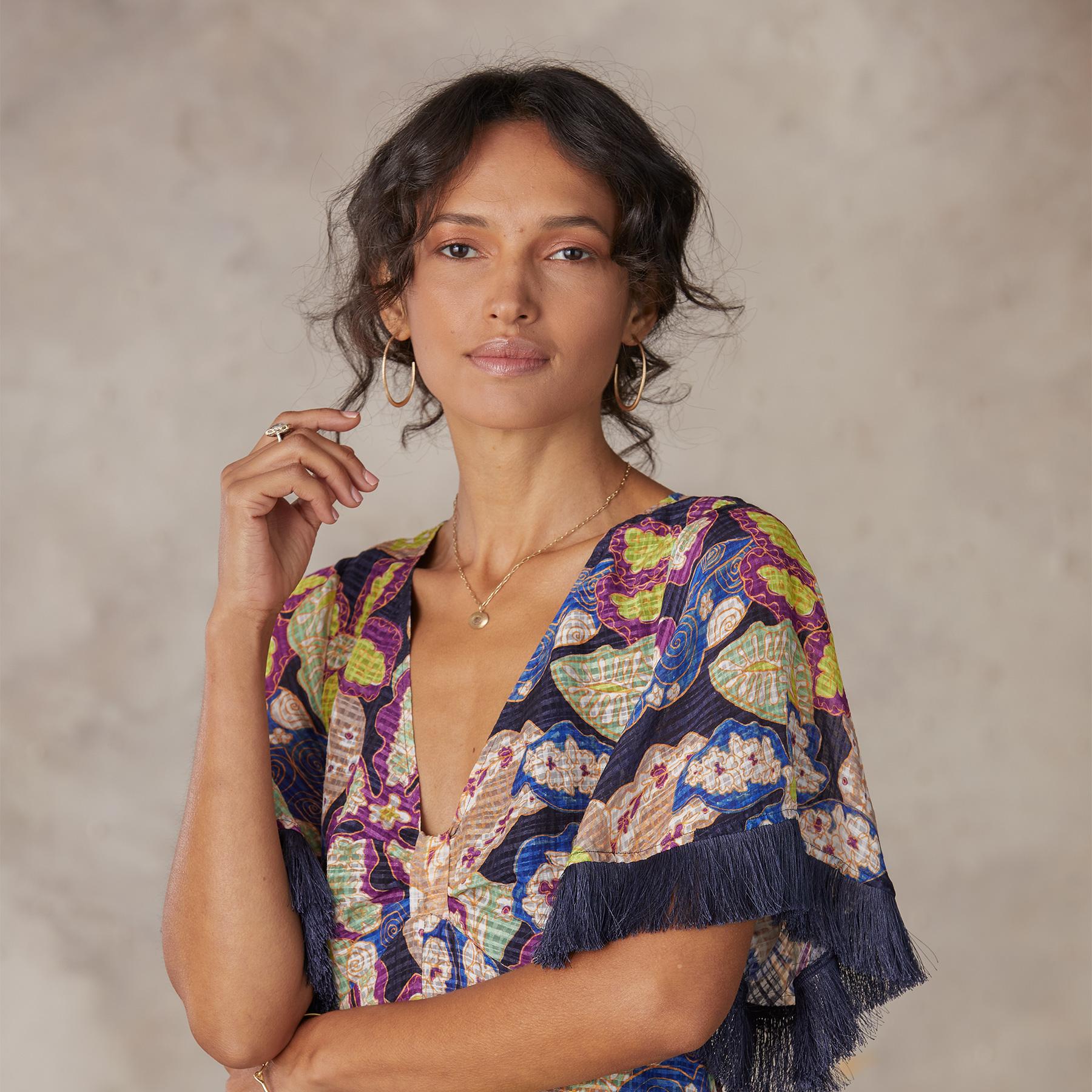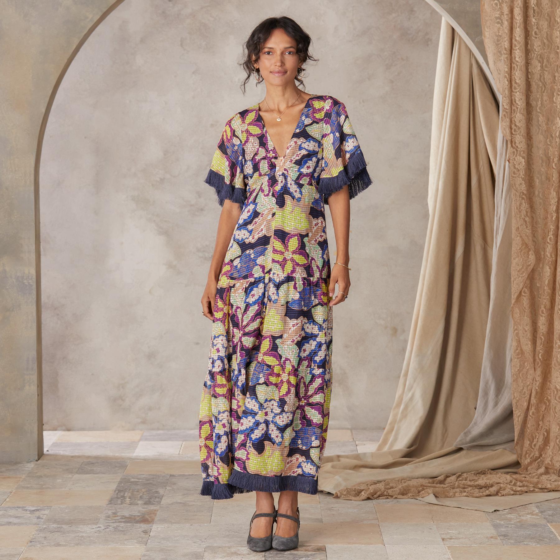 Expressive fringe at the sleeve and hem create movement on this distinctive maxi dress. Keyhole back. Linen/viscose. Dry clean. Imported. Sizes 2-16. Approx. 53l.